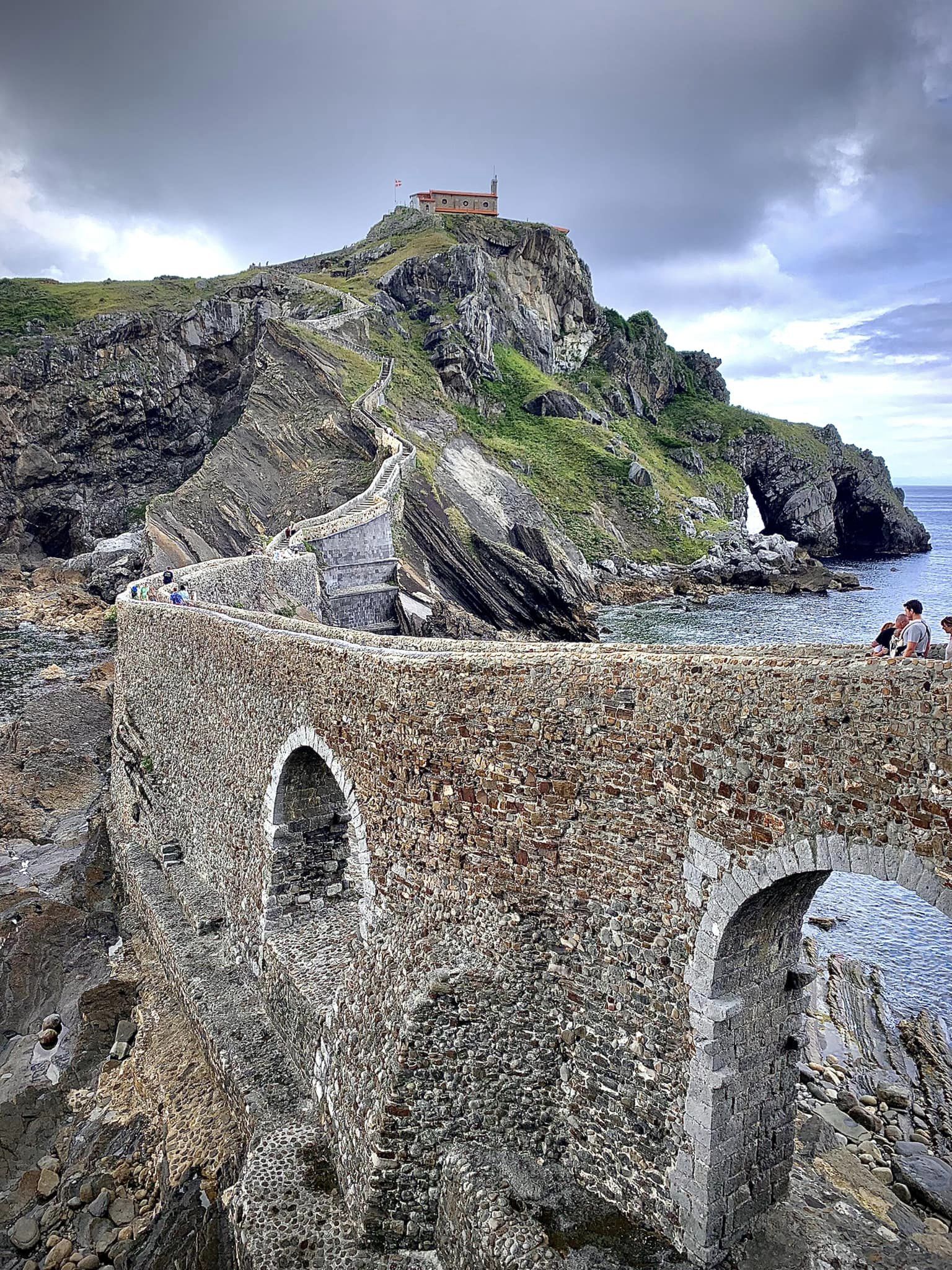 La giornata comincia lenta e con calma ci mettiamo in viaggio tra le alture dei Paesi Baschi. La vegetazione è folta, si susseguono le pinete, i monti e i pascoli, piove a dirotto e le nuvole sono basse. Ci chiediamo più volte se siamo finiti in Trentino o in Austria oppure siamo davvero in Spagna! Raggiungiamo Bakio, dove parcheggiamo per raggiungere la nostra nuova meta, solo dopo aver pranzato con pasta e pesto rosso. Ci incamminiamo così ben sazi verso l‘eremo di San Juan de Gaztelugatxe.