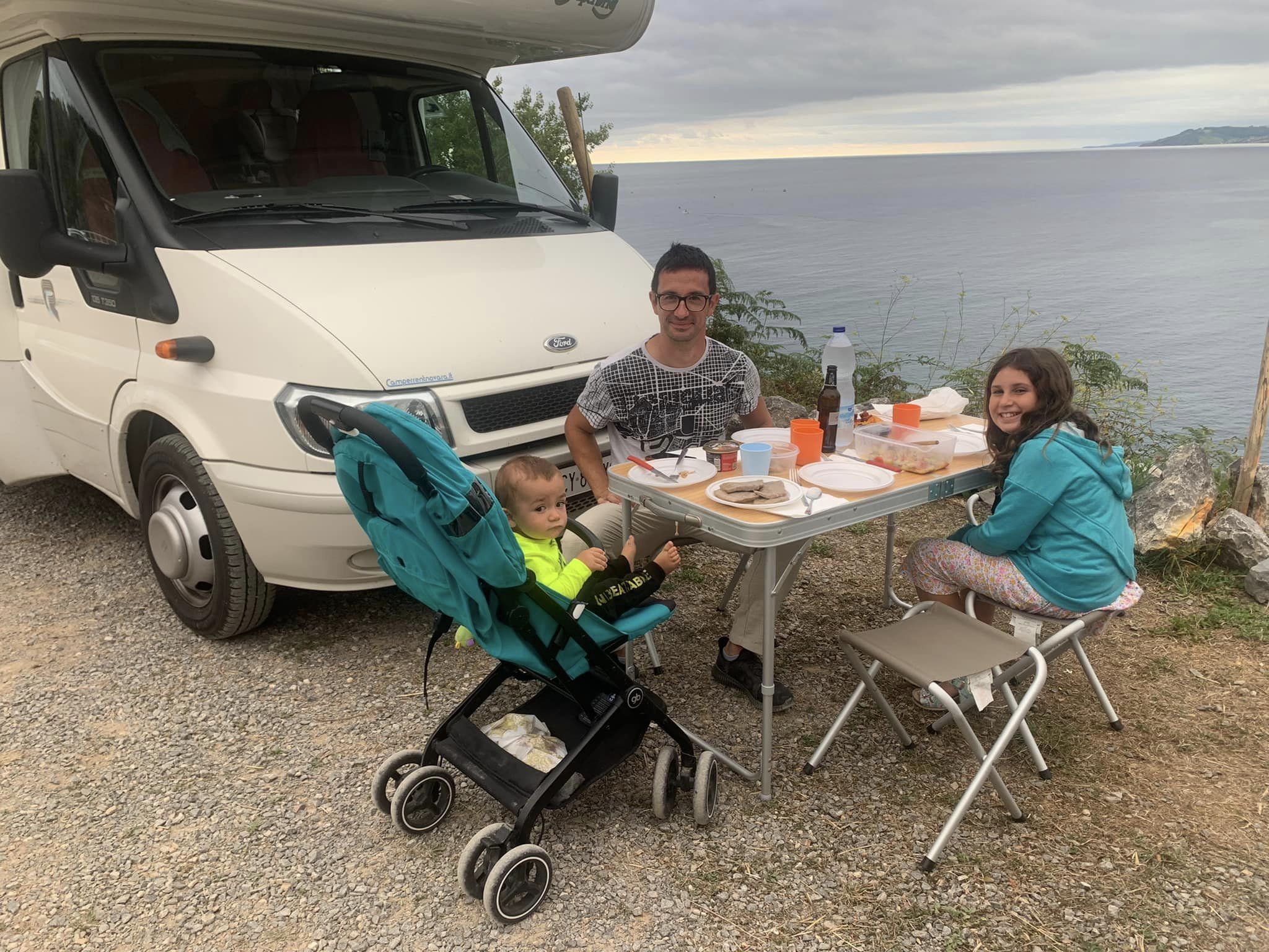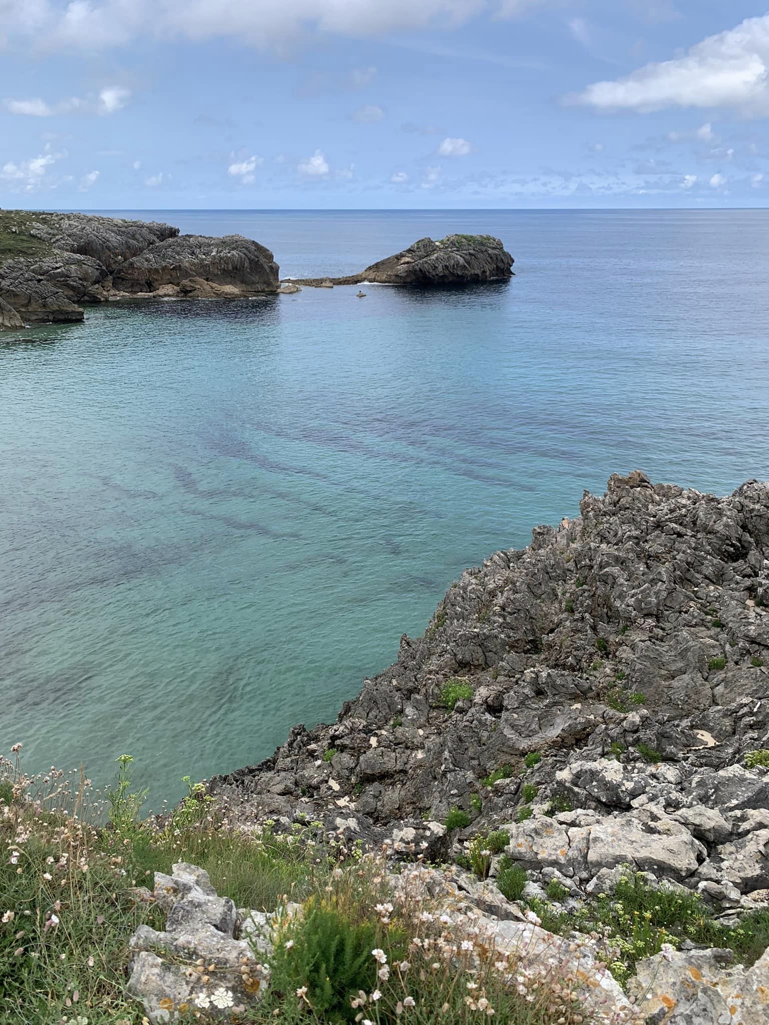La prossima tappa sarà prevalentemente fotografica per mamma, quindi cavalletto e filtri alla mano ci dirigiamo verso El Castro de Las Gaviotas, nonostante la strada sterrata da percorrere con il nostro leggero 3.5tonnellate e le mezze imprecazioni di papà Fabio. Attraverso un sentiero di montagna tra mucche e rovi arriviamo alla scogliera: WOW! Una meraviglia della natura. L’acqua è così limpida e verde e azzurra e…wow!