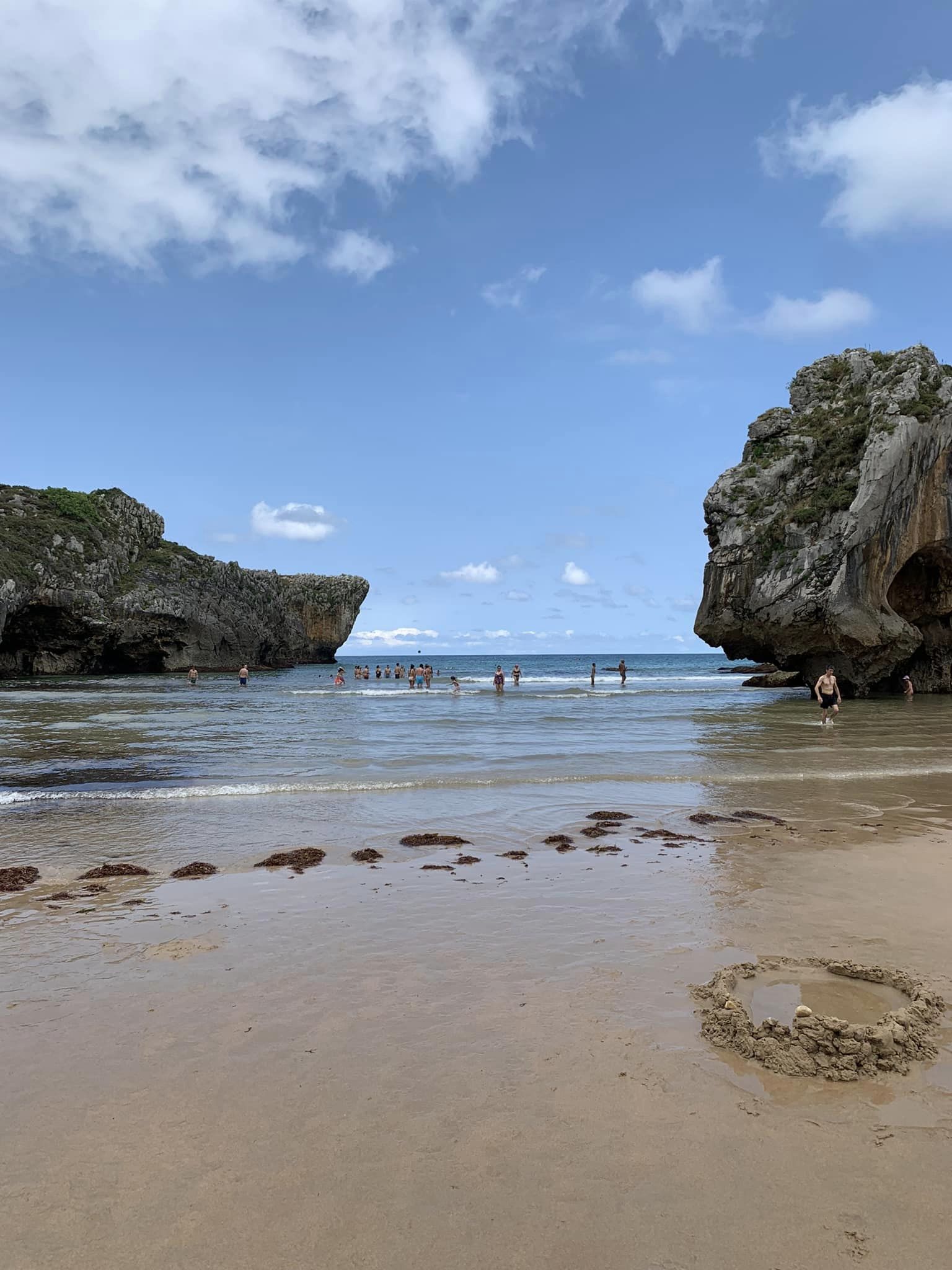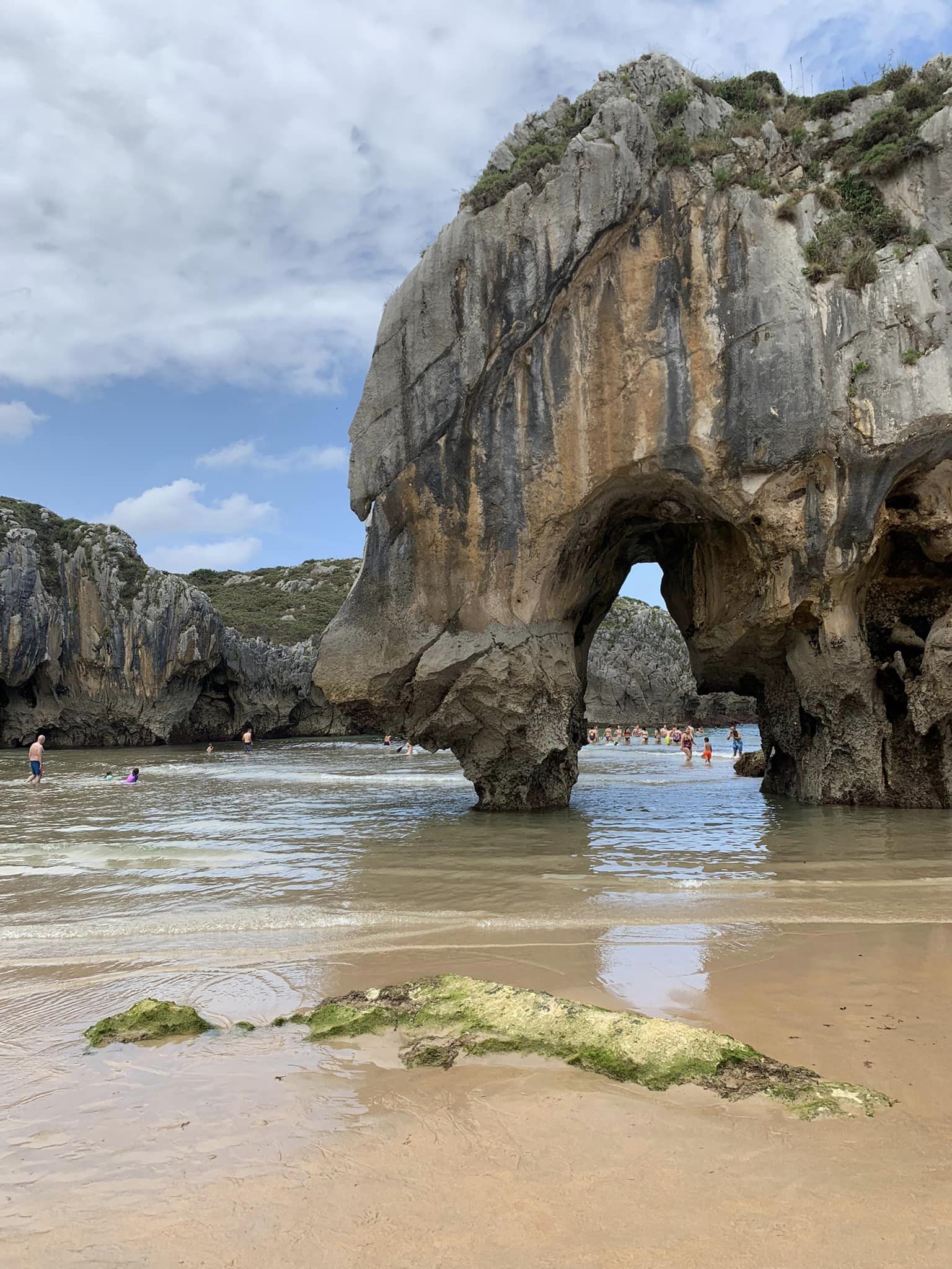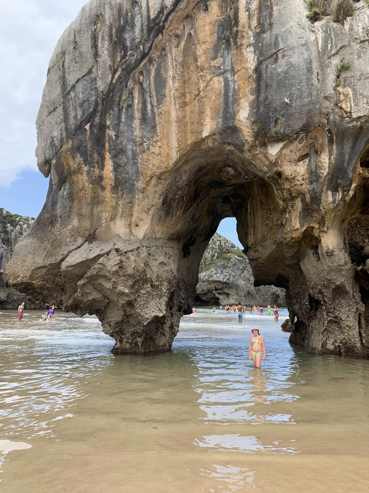 Riprendiamo il viaggio in direzione di una nuova regione, le Asturie. La tratta è proprio piacevole, tra sali e scendi, pascoli, fattorie, colline erbose, scogliere a picco sul blu, alture che si fanno sempre più ripide fino ai Picos de Europa. Miriam, come al suo solito, vorrebbe andare in spiaggia e noi la accontentiamo facendo tappa alla Playa de Cuevas del Mar: ne restiamo ammaliati e affascinati dalla particolarità del paesaggio e dalla conformazione delle caverne che si formano direttamente sul mare.