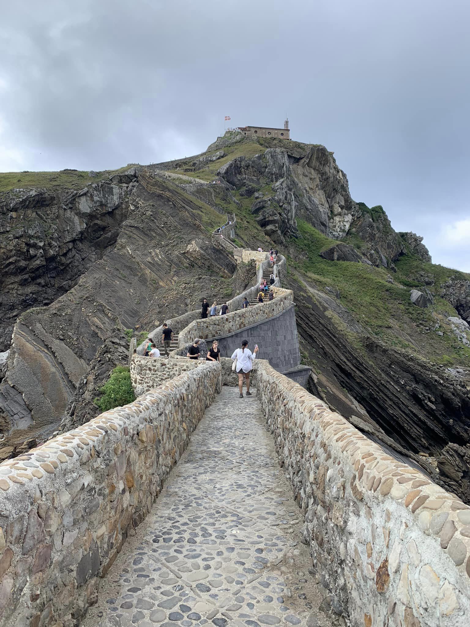 La giornata comincia lenta e con calma ci mettiamo in viaggio tra le alture dei Paesi Baschi. La vegetazione è folta, si susseguono le pinete, i monti e i pascoli, piove a dirotto e le nuvole sono basse. Ci chiediamo più volte se siamo finiti in Trentino o in Austria oppure siamo davvero in Spagna! Raggiungiamo Bakio, dove parcheggiamo per raggiungere la nostra nuova meta, solo dopo aver pranzato con pasta e pesto rosso. Ci incamminiamo così ben sazi verso l‘eremo di San Juan de Gaztelugatxe.