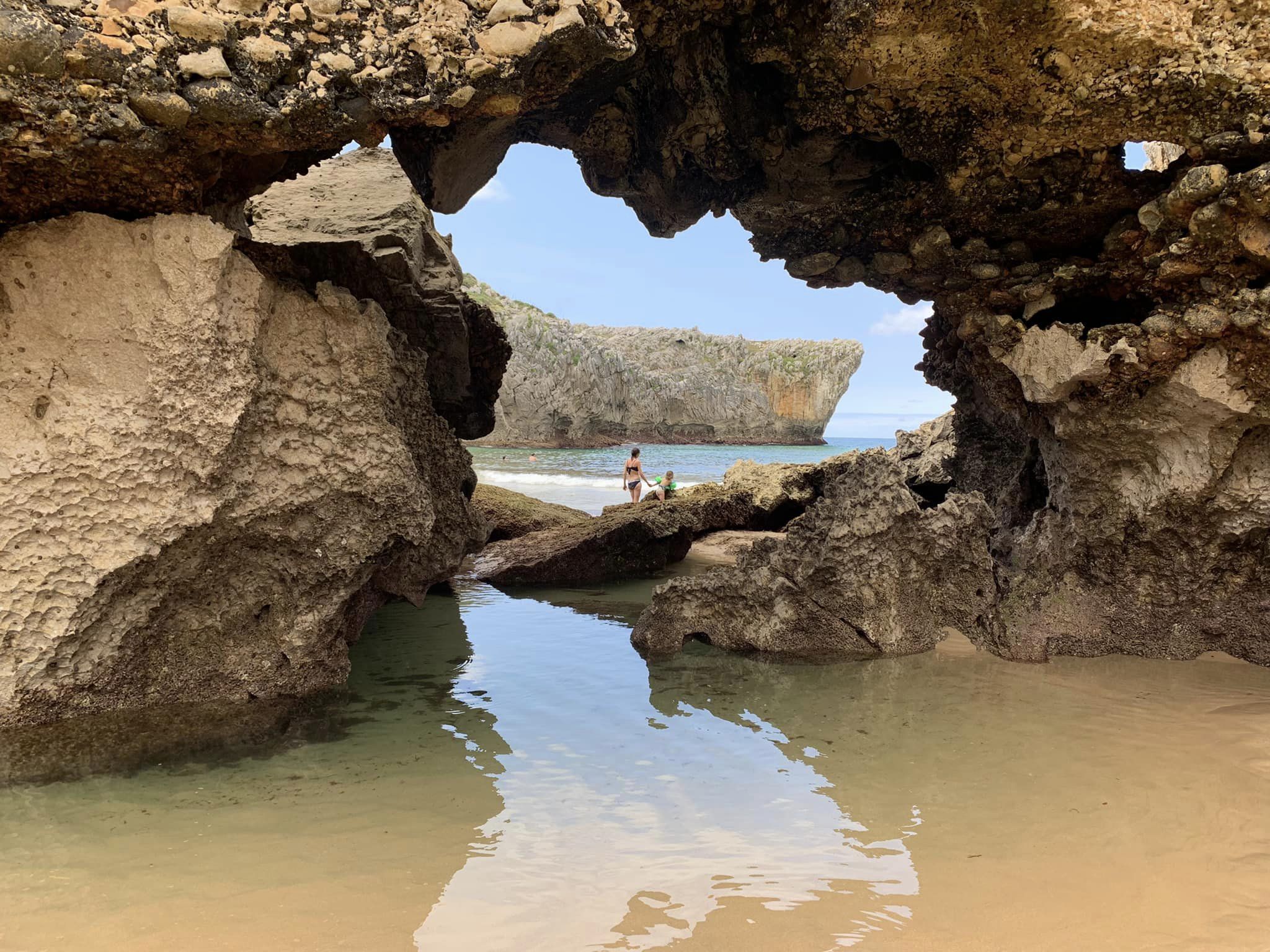 Riprendiamo il viaggio in direzione di una nuova regione, le Asturie. La tratta è proprio piacevole, tra sali e scendi, pascoli, fattorie, colline erbose, scogliere a picco sul blu, alture che si fanno sempre più ripide fino ai Picos de Europa. Miriam, come al suo solito, vorrebbe andare in spiaggia e noi la accontentiamo facendo tappa alla Playa de Cuevas del Mar: ne restiamo ammaliati e affascinati dalla particolarità del paesaggio e dalla conformazione delle caverne che si formano direttamente sul mare.